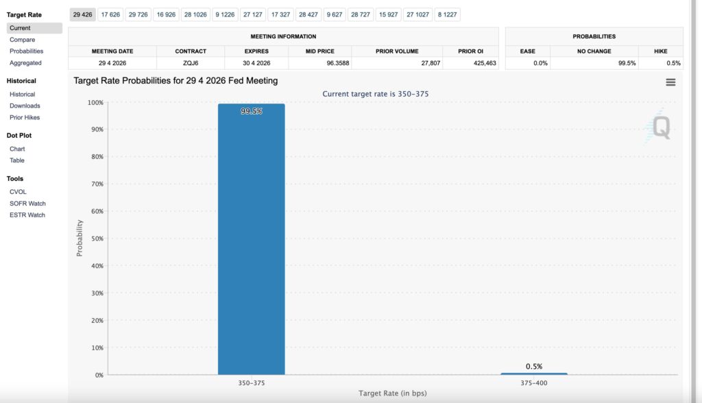 FRBの金利変動は据え置きはほぼ確定の見通しであることがフェッドウォッチからもわかります。